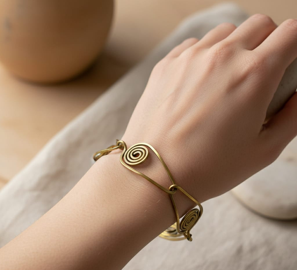 Adorn your wrist with our exquisite Handcrafted Spiral Copper Bracelet, a stunning piece that combines ancient Egyptian aesthetics with contemporary elegance. This unique bracelet features four distinctive spiral motifs connected by gracefully curved copper wire, creating a fluid, artistic design that catches the eye with its organic symmetry.