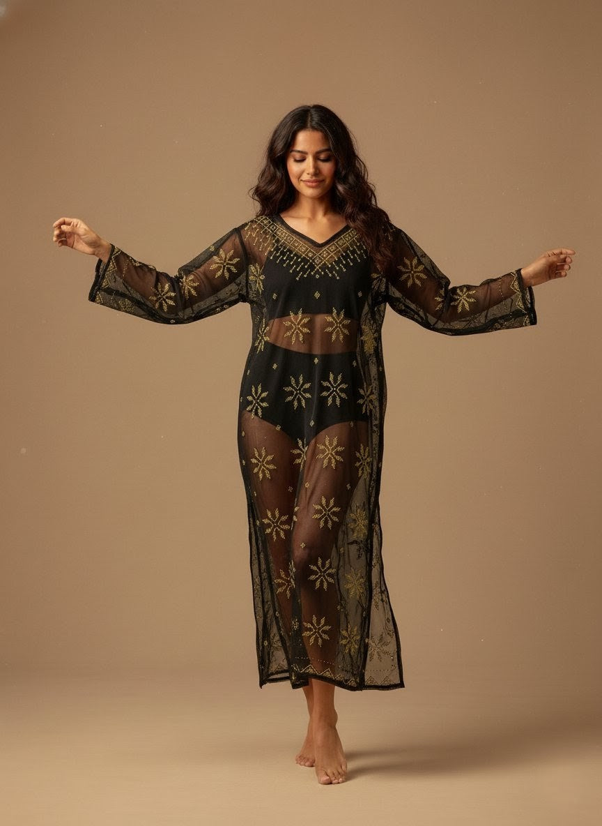 Each piece, a harmonious blend of history and luxury, is meticulously handcrafted and embroidered with golden threads that weave tales of Egyptian heritage into intricate designs.